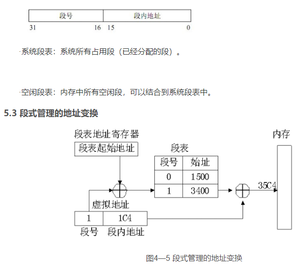(3) 由于段长不一定是2的整数次幂,因而不能简单地像分页方式那样用虚拟地址和实存地址的最低若干二进制位作为段内地址,并与段号进行直接拼接,必须用加法操作通过段起址与段内地址的求和运算得到物理地址。因此,段式存储管理比页式存储管理方式需要更多的硬件支持。