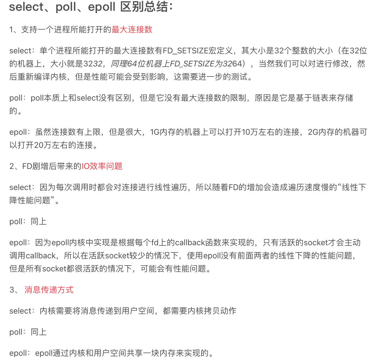 2、select低效是因为每次它都需要轮询。但低效也是相对的,视情况而定,也可通过良好的设计改善