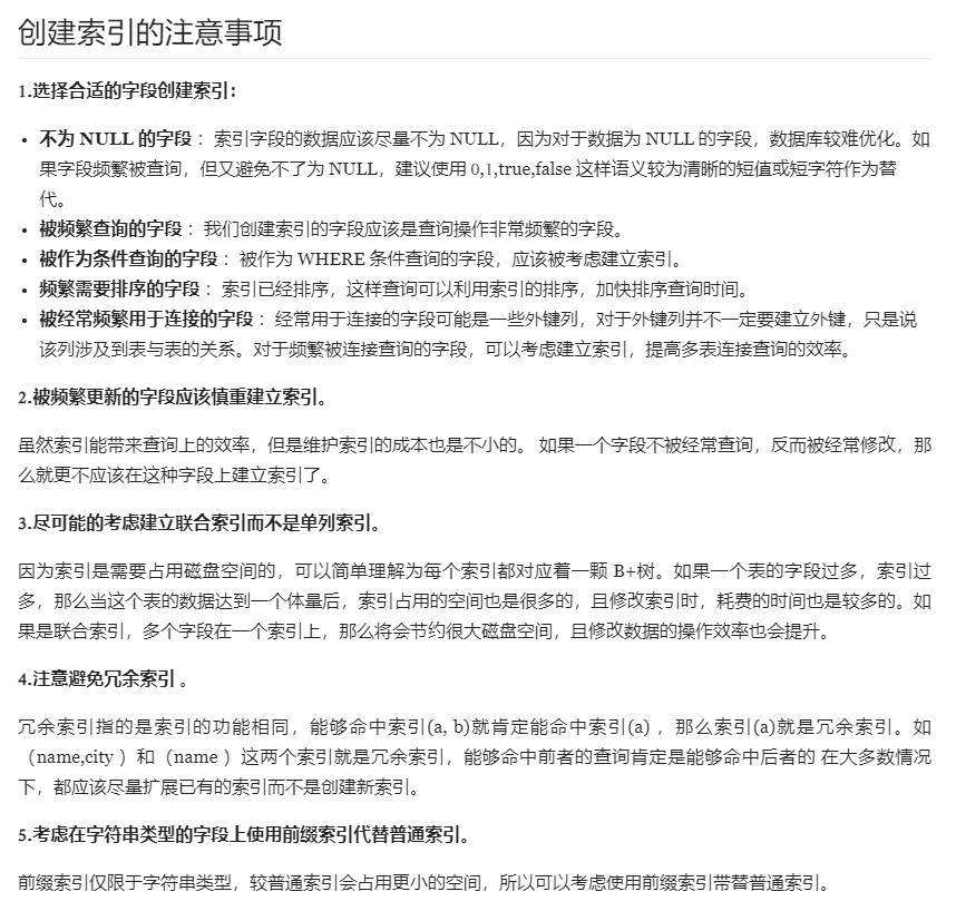 原理:select "10" > 9; 输出1,即mysql比较字符串和数字的时候会把字符串转换为数字,因此上面那条语句就变成了select * from t_user where CAST(phone AS signed int) = 1300000001;实际上还是对索引字段使用函数导致索引失效。而select * from t_user where id = "1";就不会导致索引失效,因为这条语句相当于:select * from t_user where id = CAST("1" AS signed int); 并没有对索引字段使用函数,因此索引不会失效。