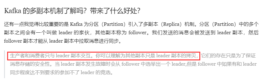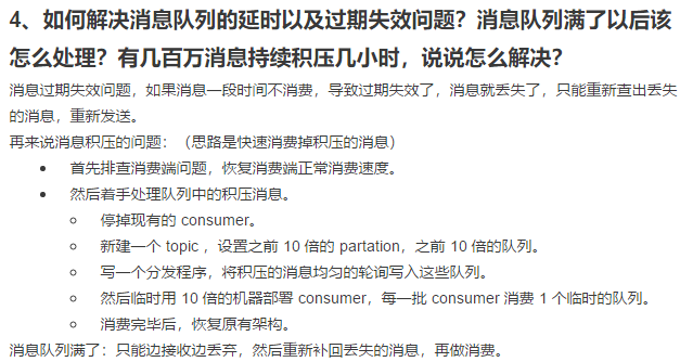 3 如果确认是消费端的处理能力不足,可以通过水平扩容来提高消费端的并发处理能力。这里有一个考点需要注意,扩容消费者的实例数量的同时,必须同步扩容topic分区数量。确保分区数和消费者的实例数相等。(因为kafka约定一个分区只能被一个消费者消费,并且分区是单线程消费。因此,消费者实例大于分区数量是没有意义的。)