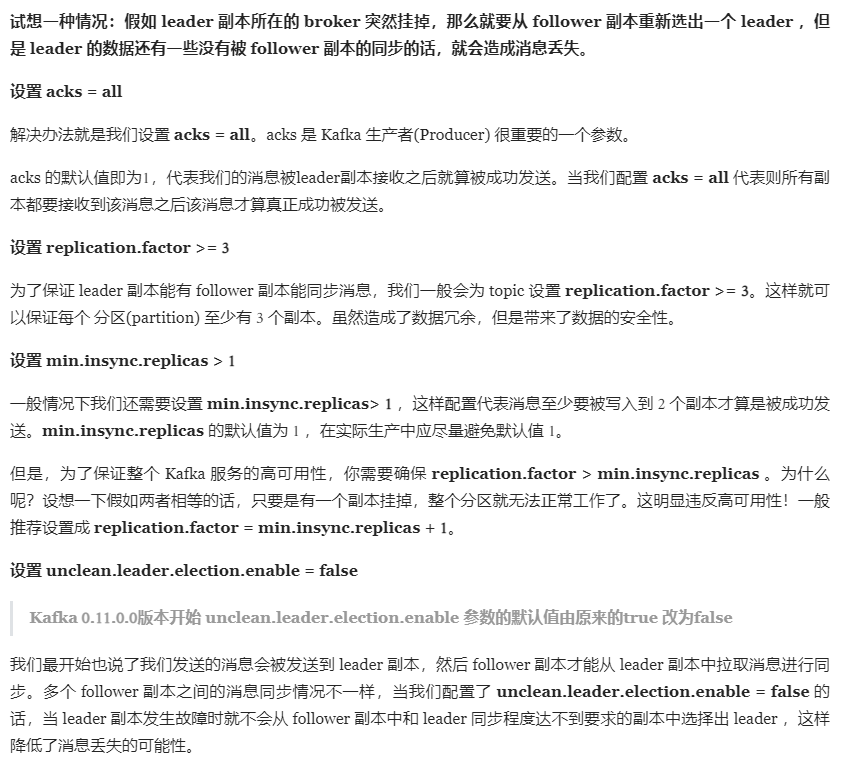 在 kafka 服务端设置min.insync.replicas参数:这个值必须大于 1,这个是要求一个 leader 至少感知到有至少一个 follower 还跟自己保持联系,没掉队,这样才能确保 leader 挂了还有一个 follower。