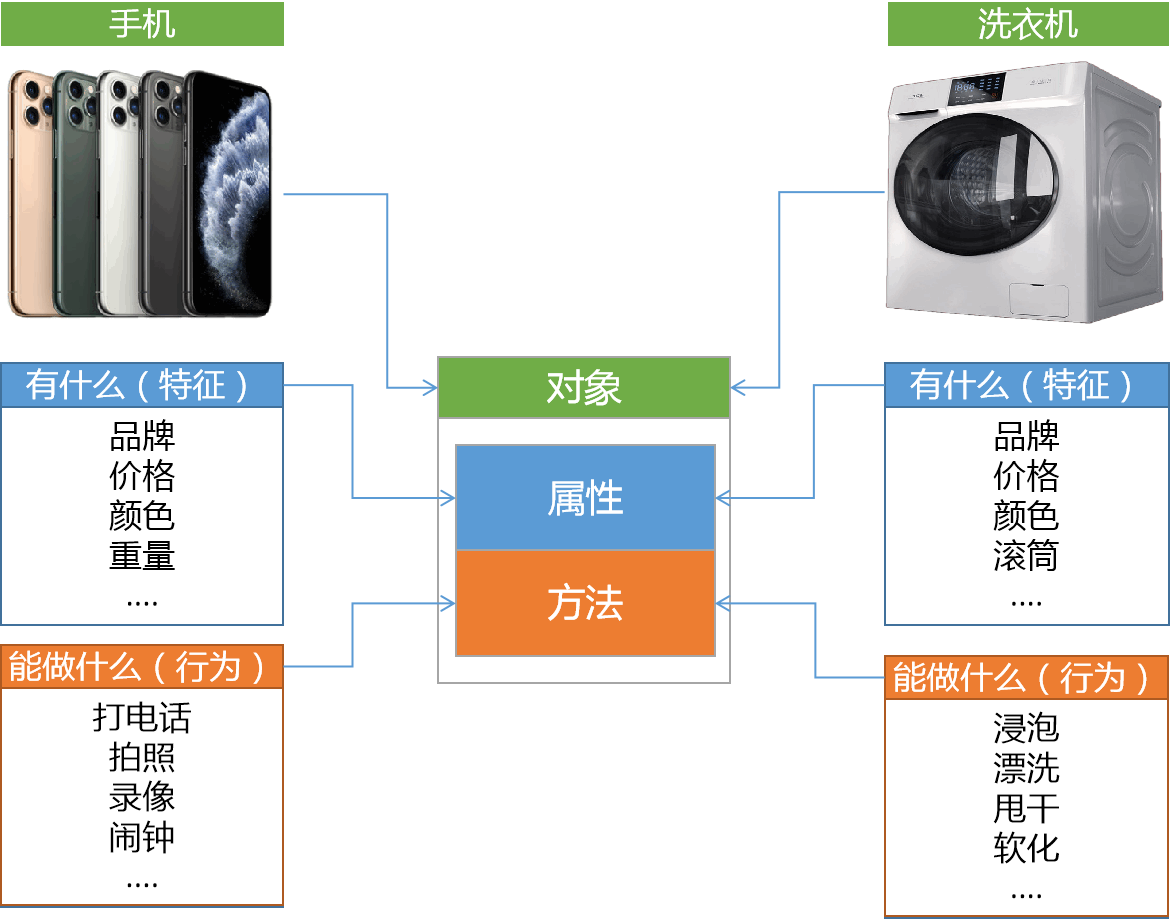 1. 对象的属性,表示对象有什么,决定了对象的特征。 2. 对象的方法,表示对象能做什么,决定了对象的行为。例:手机对象与洗衣机对象