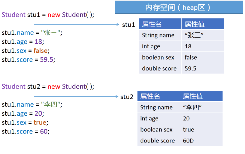 Student stu1 = new Student(); stu1.name = "张三";//为stu1的name属性赋值 stu1.age = 18; //为stu1的age属性赋值 stu1.sex = false; //为stu1的sex属性赋值 stu1.score = 59.5;//为stu1的score属性赋值 System.out.println(stu1.name);//访问stu1的name属性 System.out.println(stu1.age);//访问stu1的age属性 System.out.println(stu1.sex);//访问stu1的sex属性 System.out.println(stu1.score);//访问stu1的score属性 Student stu2 = new Student(); stu2.name = "李四";//为stu2的name属性赋值 stu2.age = 20; //为stu2的age属性赋值 stu2.sex = true; //为stu2的sex属性赋值 stu2.score = 60D; //为stu2的score属性赋值 System.out.println(stu2.name);//访问stu2的name属性 System.out.println(stu2.age);//访问stu2的age属性 System.out.println(stu2.sex);//访问stu2的sex属性 System.out.println(stu2.score);//访问stu2的score属性注意:数据类型必须兼容