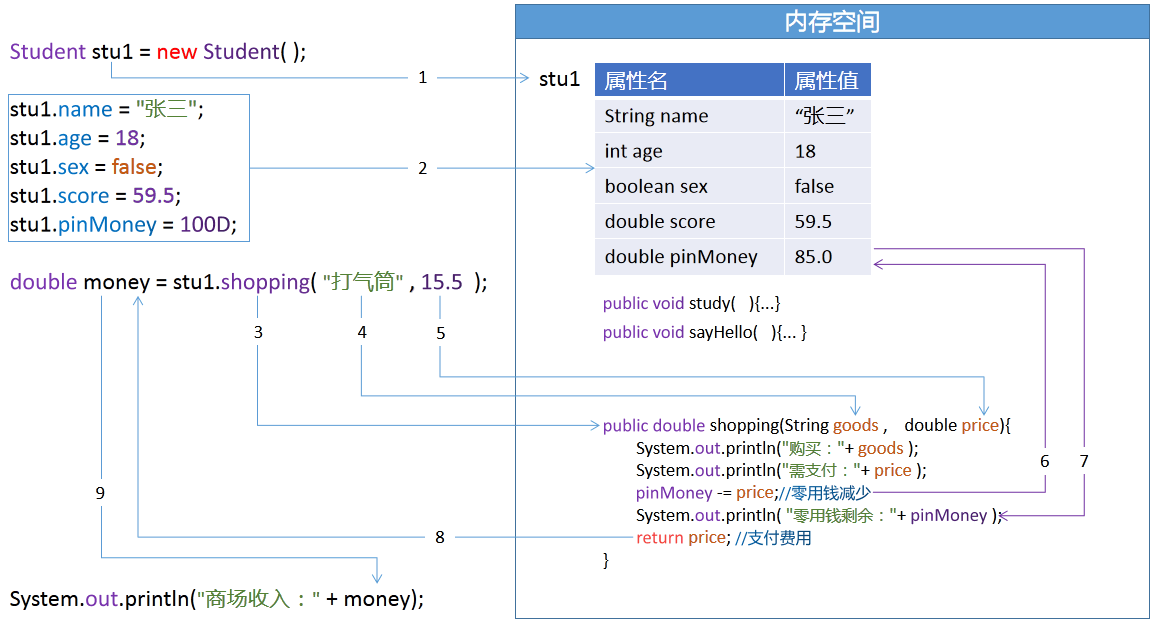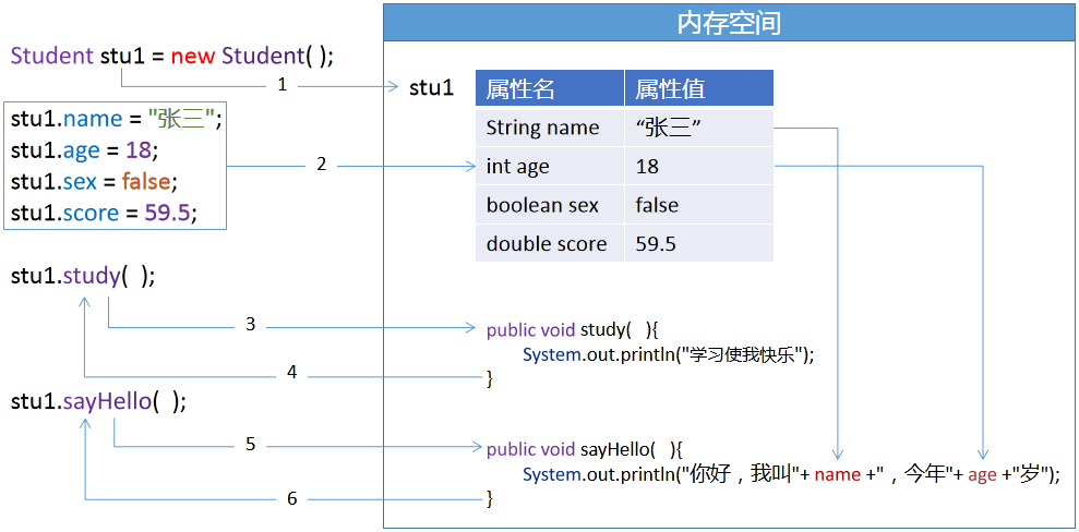 Student stu1 = new Student(); stu1.name = "张三"; stu1.age = 18; stu1.score = 59.5; stu1.sex = false; stu1.study();//调用stu1中的study方法 stu1.sayHello();//调用stu1中的sayHello方法执行流程:
