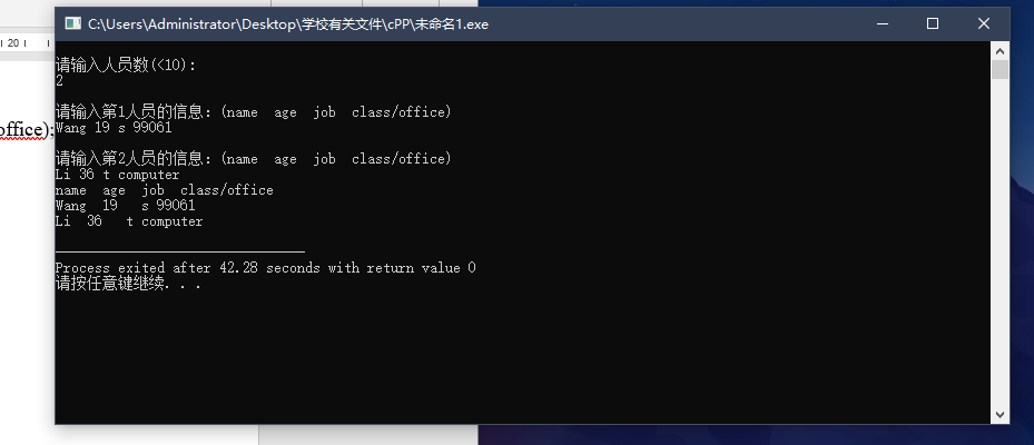 printf("\n请输入第%d人员的信息:(name age job class/office)\n",i+1);