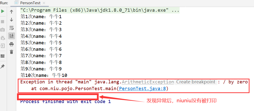 假如在牛牛的run()方法和niuniu的run()方法之间加一个异常(这里我用运算异常:除法分母不能为零的异常),会发现,niuniu就不打印了,如下图所示: