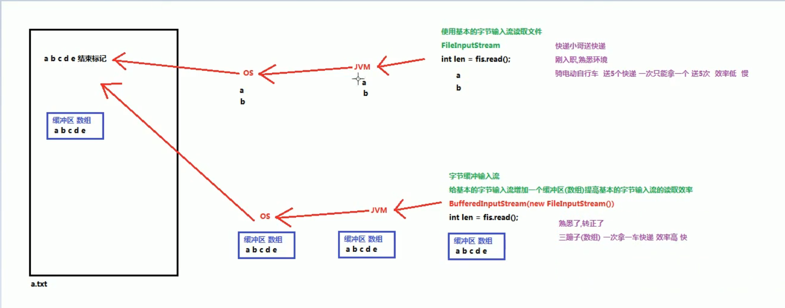 InputStream in:字节输入流 传入一个FileInputStream,缓冲流就会给FileInputStream增加一个缓冲区,提高FileInputStream的读取效率