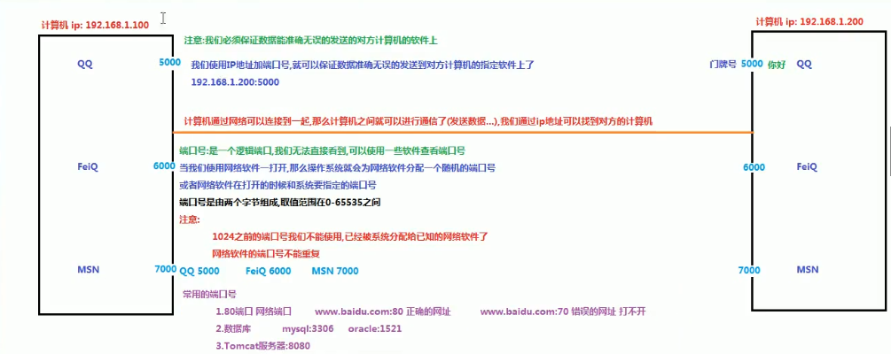 - 端口号︰用两个字节表示的整数,它的取值范围是0~65535。 其中,0~1023之间的端口号用于一些知名的网络服务和应用,普通的应用程序需要使用1024以上的端口号。如果端口号被另外一个服务或应用所占用,会导致当前程序启动失败。