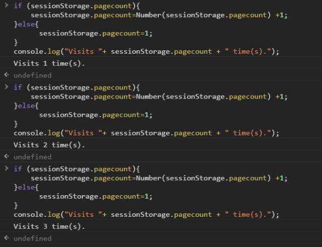 console.log("Visits "+ sessionStorage.pagecount + " time(s).");