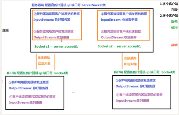 - 多个客户端跟服务器端进行交流时,就要使用多个IO流对象。但是在服务器端并没有IO对象,而是使用客户端的流对象。