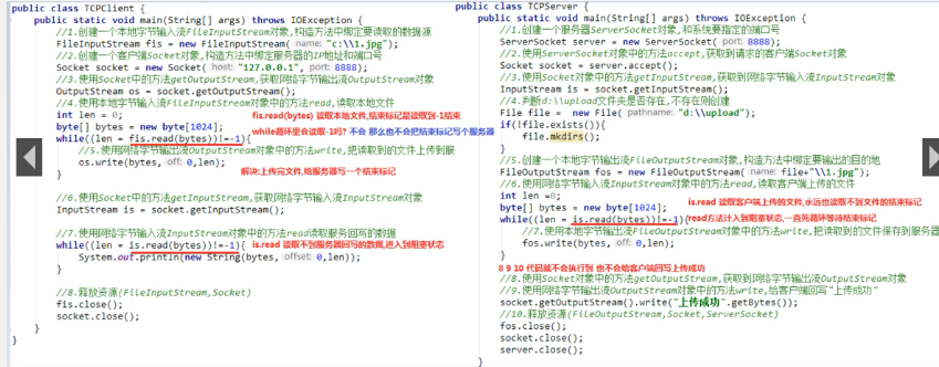 //客户端不会输出上传成功,两边的程序进入了阻塞状态。在客户端读取文件上传到服务器端时,read方法出现堵塞