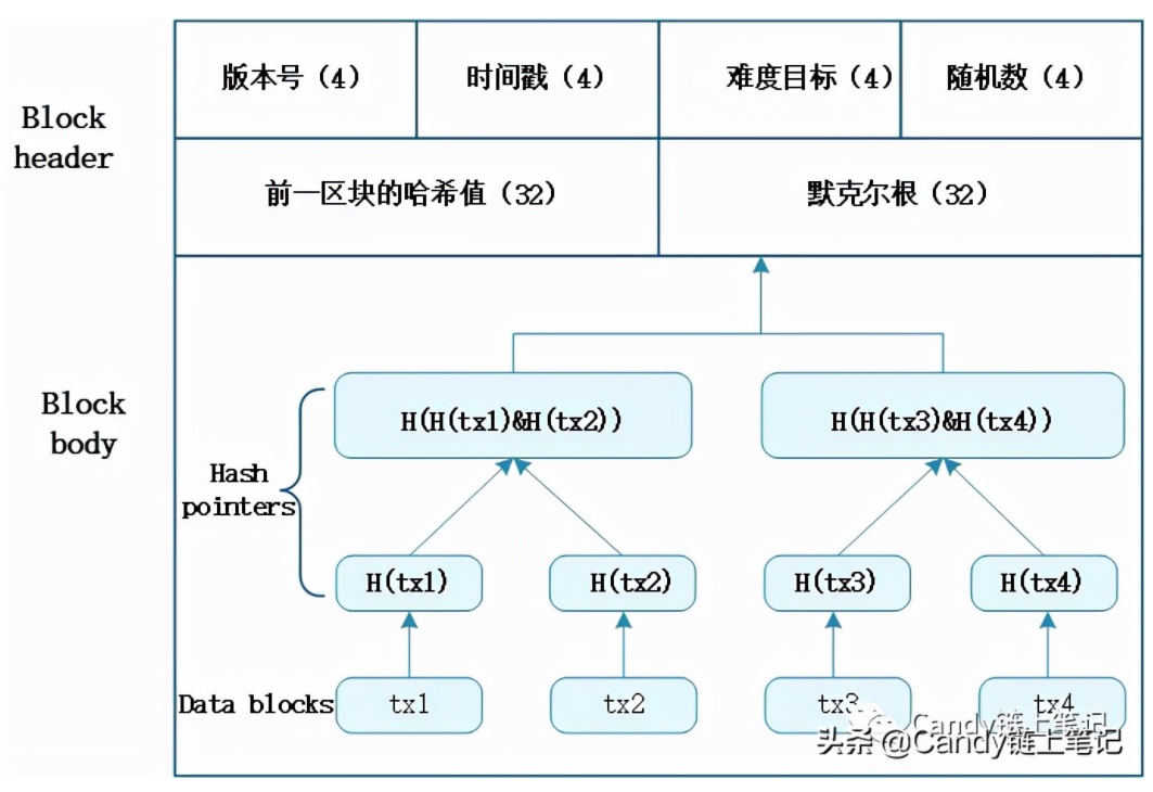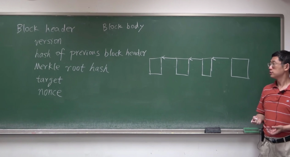 block header:version 前一个块头的hash指针,merkle tree hash,target,nonce