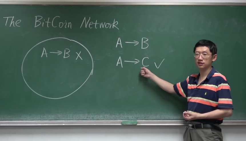 每个结点维护一个集合,等待写入区块,并转发给邻居结点,若一个结点同时发布两个有冲突的交易,先收到的存入集合,后面的忽略,只会一种合法,网络上传播两种,新发布的交易和新发布的区块,新发布的区块有A->C,则A_>B集合中删掉