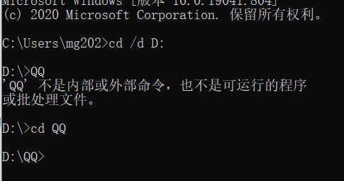 盘符切换: 盘+:冒号。C:\Users\mg202>D: