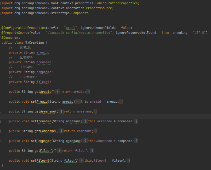 @ConfigurationProperties(prefix = "remote", ignoreUnknownFields = false) 该注解用于绑定属性。prefix用来选择属性的前缀,也就是在remote.properties文件中的“remote”,ignoreUnknownFields是用来告诉SpringBoot在有属性不能匹配到声明的域时抛出异常。