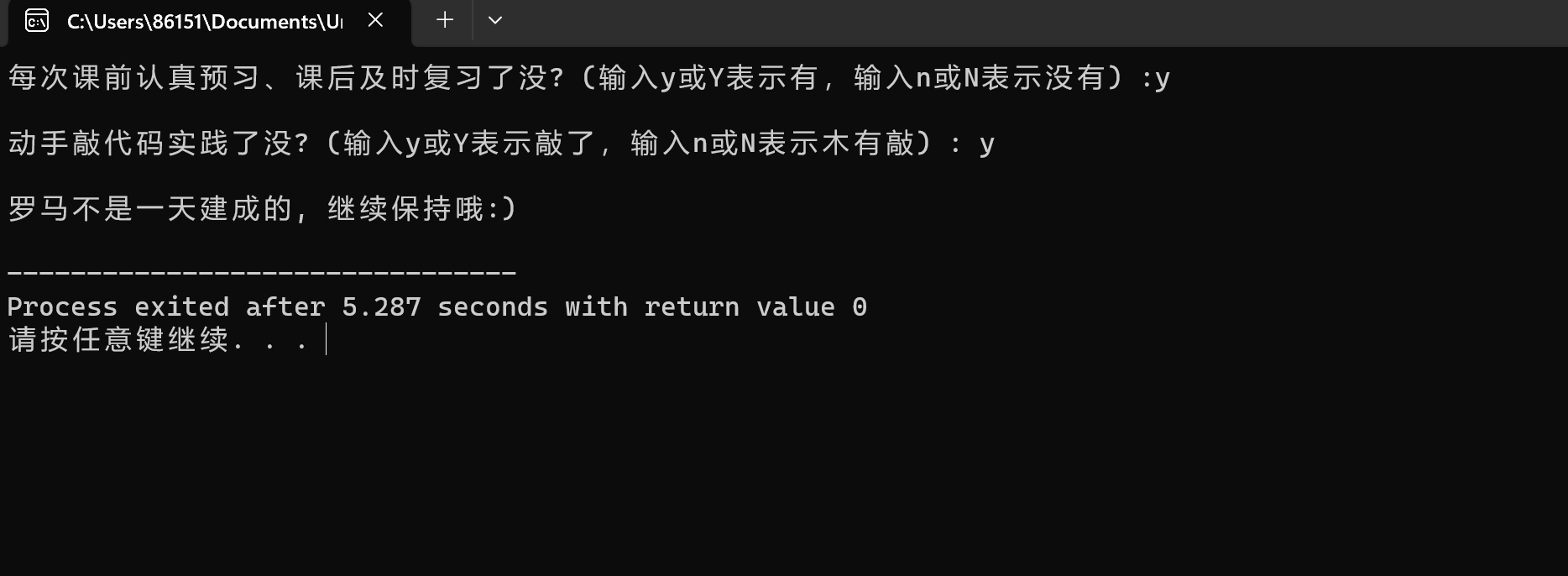 printf("\n罗马不是一天建成的, 继续保持哦:)\n");