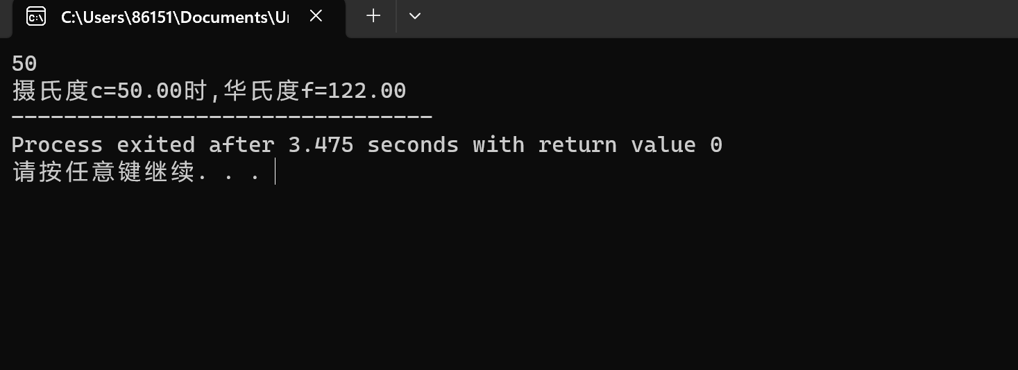 printf("摄氏度c=%.2lf时,华氏度f=%.2lf",C,F);