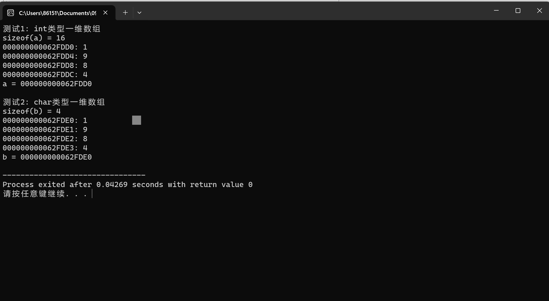 #include <stdio.h> #define N 4 void test1() { int a[N] = {1, 9, 8, 4}; int i; // 输出数组a占用的内存字节数 printf("sizeof(a) = %d\n", sizeof(a)); // 输出int类型数组a中每个元素的地址、值 for (i = 0; i < N; ++i) printf("%p: %d\n", &a[i], a[i]); // 输出数组名a对应的值 printf("a = %p\n", a); } void test2() { char b[N] = {'1', '9', '8', '4'}; int i; // 输出数组b占用的内存字节数 printf("sizeof(b) = %d\n", sizeof(b)); // 输出char类型数组b中每个元素的地址、值 for (i = 0; i < N; ++i) printf("%p: %c\n", &b[i], b[i]); // 输出数组名b对应的值 printf("b = %p\n", b); } int main() { printf("测试1: int类型一维数组\n"); test1(); printf("\n测试2: char类型一维数组\n"); test2(); return 0; }