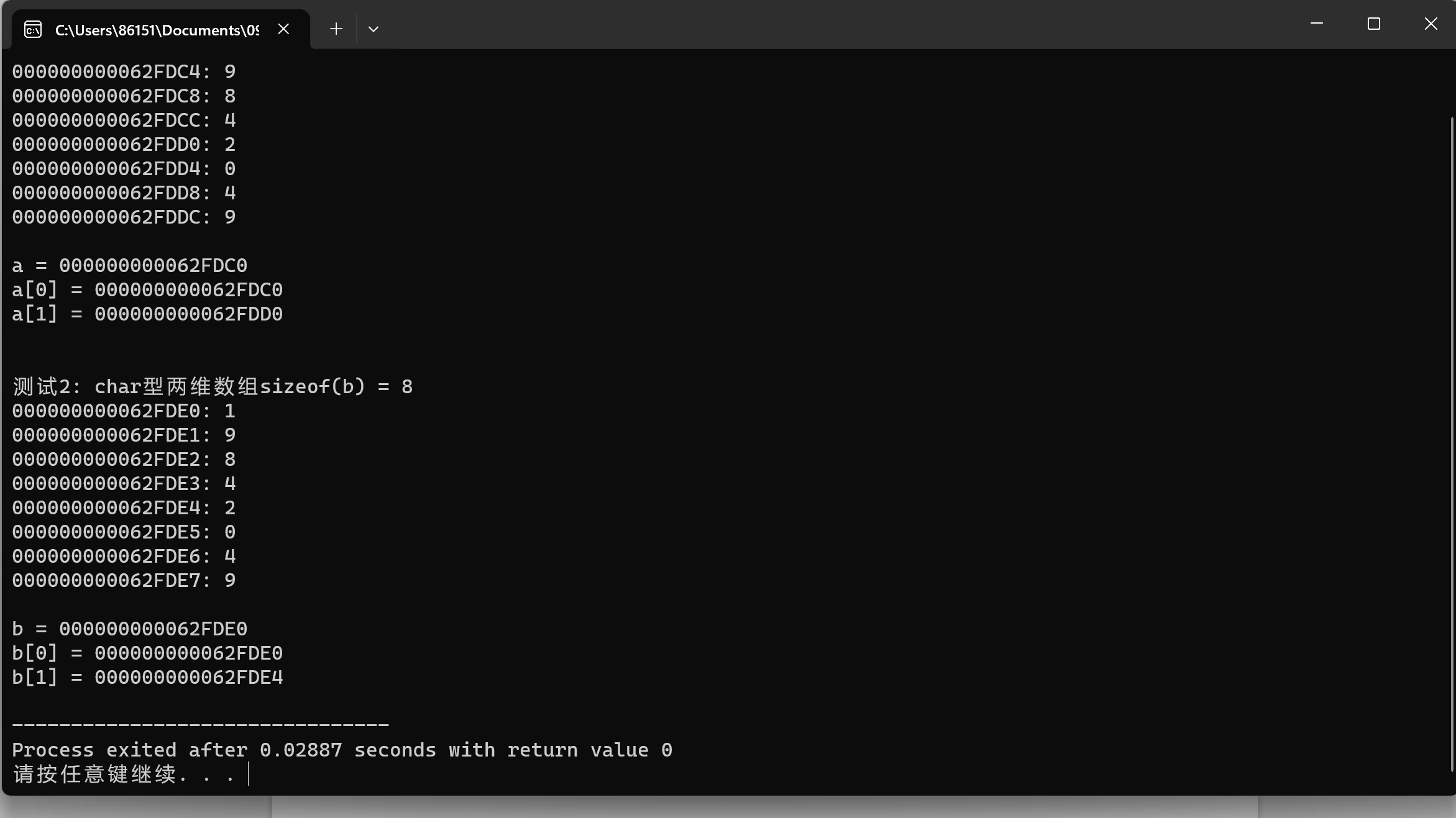 #include <stdio.h> #define N 2 #define M 4 void test1() { int a[N][M] = {{1, 9, 8, 4}, {2, 0, 4, 9}}; int i, j; // 输出int类型二维数组a占用的内存字节数 printf("sizeof(a) = %d\n", sizeof(a)); for (i = 0; i < N; ++i) for (j = 0; j < M; ++j) printf("%p: %d\n", &a[i][j], a[i][j]); printf("\n"); // 输出int类型二维数组名a, 以及,a[0], a[1]的值 printf("a = %p\n", a); printf("a[0] = %p\n", a[0]); printf("a[1] = %p\n", a[1]); printf("\n"); } void test2() { char b[N][M] = {{'1', '9', '8', '4'}, {'2', '0', '4', '9'}}; int i, j; // 输出char类型二维数组b占用的内存字节数 printf("sizeof(b) = %d\n", sizeof(b)); // 输出char类型二维数组b中每个元素的地址、值 for (i = 0; i < N; ++i) for (j = 0; j < M; ++j) printf("%p: %c\n", &b[i][j], b[i][j]); printf("\n"); // 输出char类型二维数组名b, 以及,b[0], b[1]的值 printf("b = %p\n", b); printf("b[0] = %p\n", b[0]); printf("b[1] = %p\n", b[1]); } int main() { printf("测试1: int型两维数组"); test1(); printf("\n测试2: char型两维数组"); test2(); return 0; }