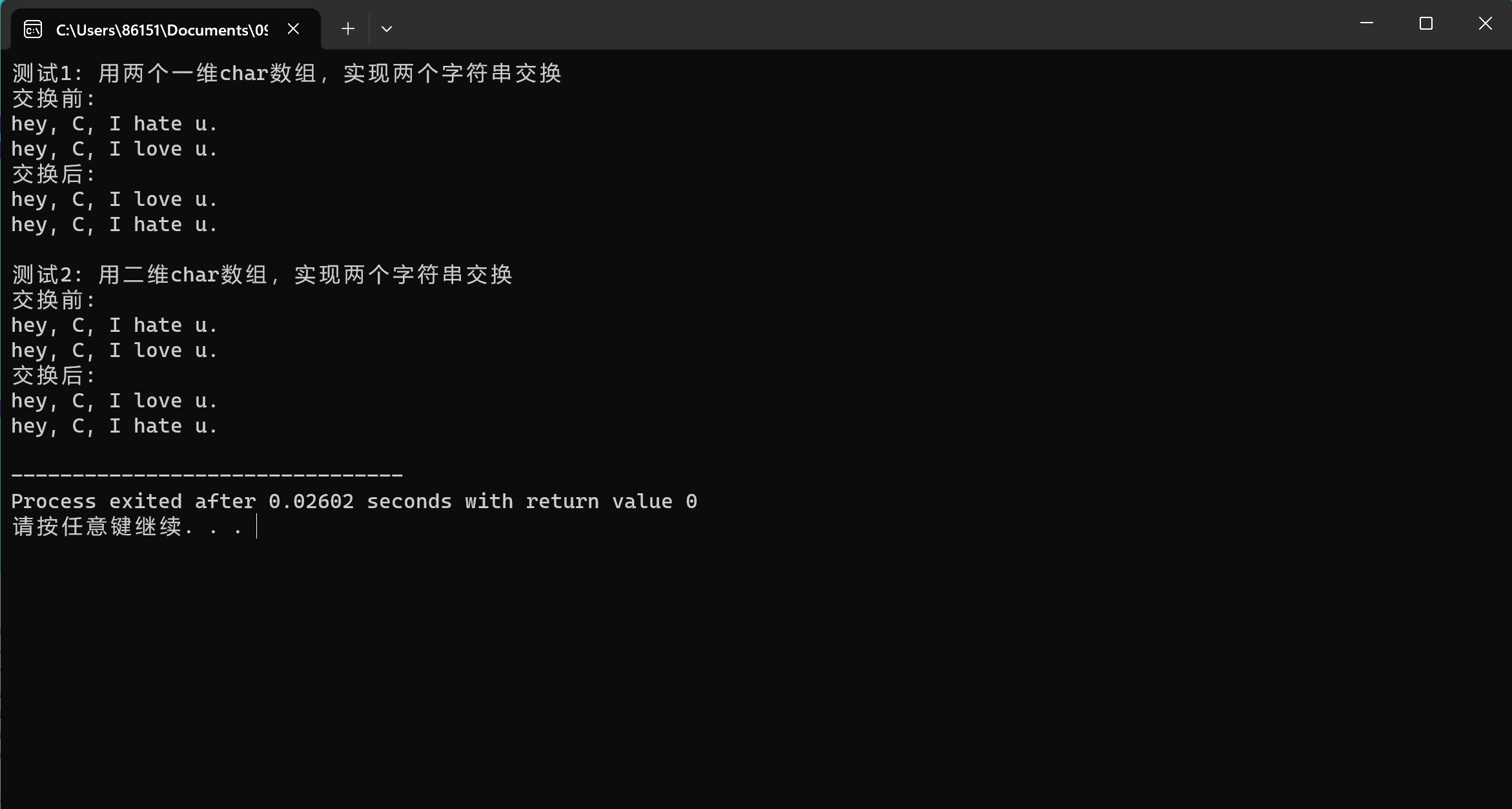 #include <stdio.h> #include <string.h> #define N 80 void swap_str(char s1[N], char s2[N]); void test1(); void test2(); int main() { printf("测试1: 用两个一维char数组,实现两个字符串交换\n"); test1(); printf("\n测试2: 用二维char数组,实现两个字符串交换\n"); test2(); return 0; } void test1() { char views1[N] = "hey, C, I hate u."; char views2[N] = "hey, C, I love u."; printf("交换前: \n"); puts(views1); puts(views2); swap_str(views1, views2); printf("交换后: \n"); puts(views1); puts(views2); } void test2() { char views[2][N] = {"hey, C, I hate u.", "hey, C, I love u."}; printf("交换前: \n"); puts(views[0]); puts(views[1]); swap_str(views[0], views[1]); printf("交换后: \n"); puts(views[0]); puts(views[1]); } void swap_str(char s1[N], char s2[N]) { char tmp[N]; strcpy(tmp, s1); strcpy(s1, s2); strcpy(s2, tmp); }