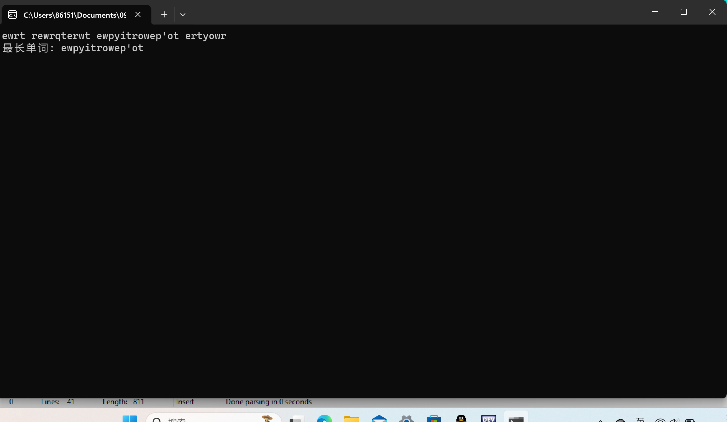 #include <stdio.h> #define N 1000 int main() { char line[N]; int word_len; // 记录当前单词长度 int max_len; // 记录最长单词长度 int end; // 记录最长单词结束位置 int i; while(gets(line) != NULL) { word_len = 0; max_len = 0; end = 0; i = 0; while(1) { // 跳过连续空格 while(line[i] == ' ') { word_len = 0; // 单词长度置0,为新单词统计做准备 i++; } // 在一个单词中,统计当前单词长度 while(line[i] != '\0' && line[i] != ' ') { word_len++; i++; } // 更新更长单词长度,并,记录最长单词结束位置 if(max_len < word_len) { max_len = word_len; end = i; // end保存的是单词结束的下一个坐标位置 } // 遍历到文本结束时,终止循环 if(line[i] == '\0') break; } // 输出最长单词 printf("最长单词: "); for(i = end - max_len; i < end; ++i) printf("%c", line[i]); printf("\n\n"); } return 0; }