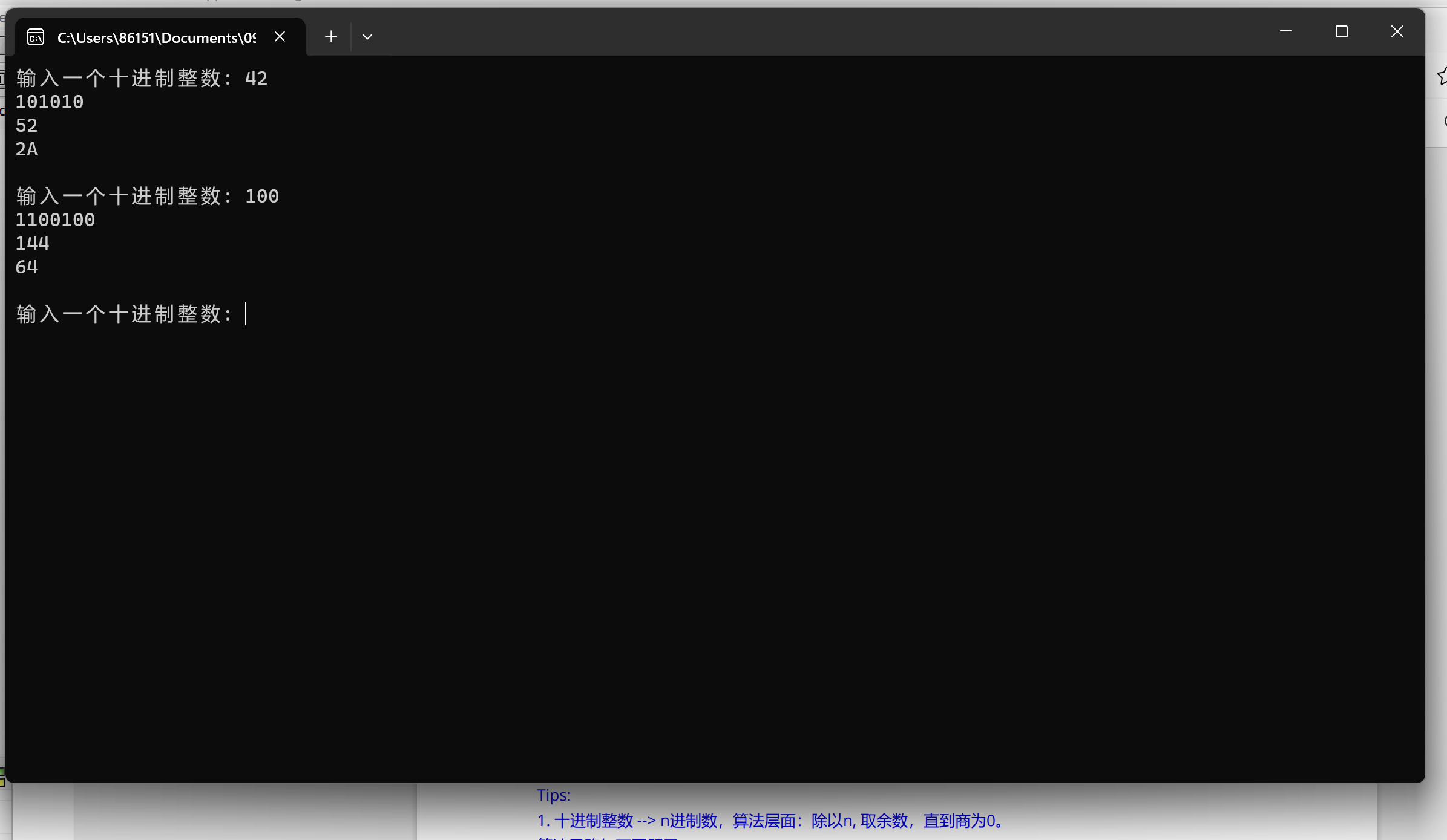 #include <stdio.h> #define N 100 void dec_to_n(int x, int n); // 函数声明 int main() { int x; printf("输入一个十进制整数: "); while(scanf("%d", &x) != EOF) { dec_to_n(x, 2); // 函数调用: 把x转换成二进制输出 dec_to_n(x, 8); // 函数调用: 把x转换成八进制输出 dec_to_n(x, 16); // 函数调用: 把x转换成十六进制输出 printf("\n输入一个十进制整数: "); } return 0; } void dec_to_n(int x,int n) { int s,sum,i=0,k=1,l,m,b; int a[100]; while(x>=1){ a[i]=x%n; x/=n; i++; } for(m=i-1;m>=0;m--){ if(a[m]>=10) { b=a[m]; printf("%c",'A'+b-10); } else { printf("%d",a[m]); } } k=1; sum=0; printf("\n"); }