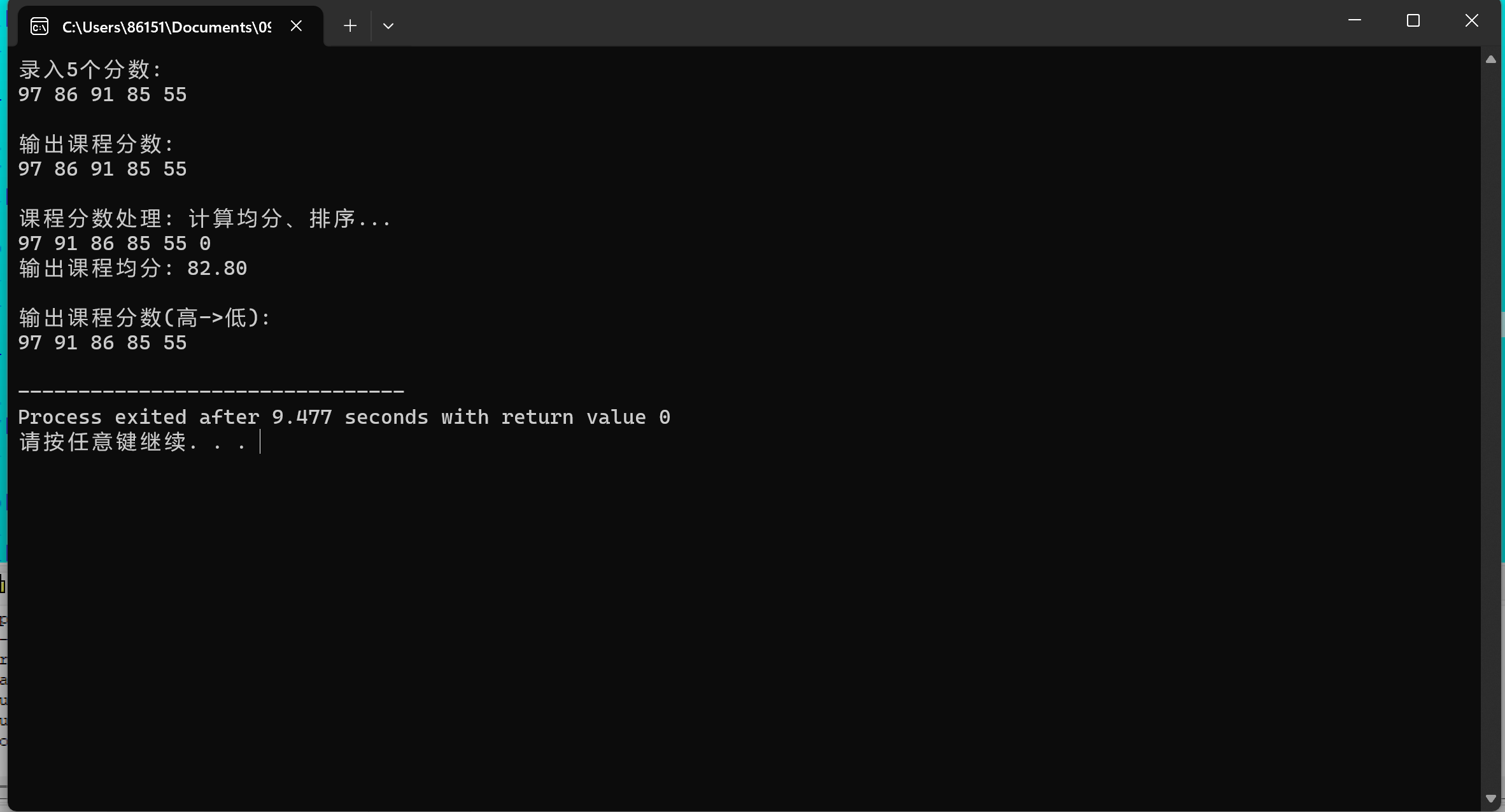 #include <stdio.h> #define N 5 // 函数声明 void input(int x[], int n); void output(int x[], int n); double average(int x[], int n); void bubble_sort(int x[], int n); int main() { int scores[N]; double ave; printf("录入%d个分数:\n", N); input(scores, N); printf("\n输出课程分数: \n"); output(scores, N); printf("\n课程分数处理: 计算均分、排序...\n"); ave = average(scores, N); bubble_sort(scores, N); printf("\n输出课程均分: %.2f\n", ave); printf("\n输出课程分数(高->低):\n"); output(scores, N); return 0; } // 函数定义 // 输入n个整数保存到整型数组x中 void input(int x[], int n) { int i; for(i = 0; i < n; ++i) scanf("%d", &x[i]); } // 输出整型数组x中n个元素 void output(int x[], int n) { int i; for(i = 0; i < n; ++i) printf("%d ", x[i]); printf("\n"); } double average(int x[],int n) { int i,sum=0; double j; for(i=0;i<=n;i++) sum+=x[i]; j=sum*1.0/n*1.0; return j; } void bubble_sort(int x[], int n) { int i,u,b,j; for(i=n;i>=0;i--) { for(b=i-1;b>=0;b--) { if(x[i]>x[b]) { u=x[b]; x[b]=x[i]; x[i]=u; } } } for(j=0;j<=n;j++) printf("%d ",x[j]); }