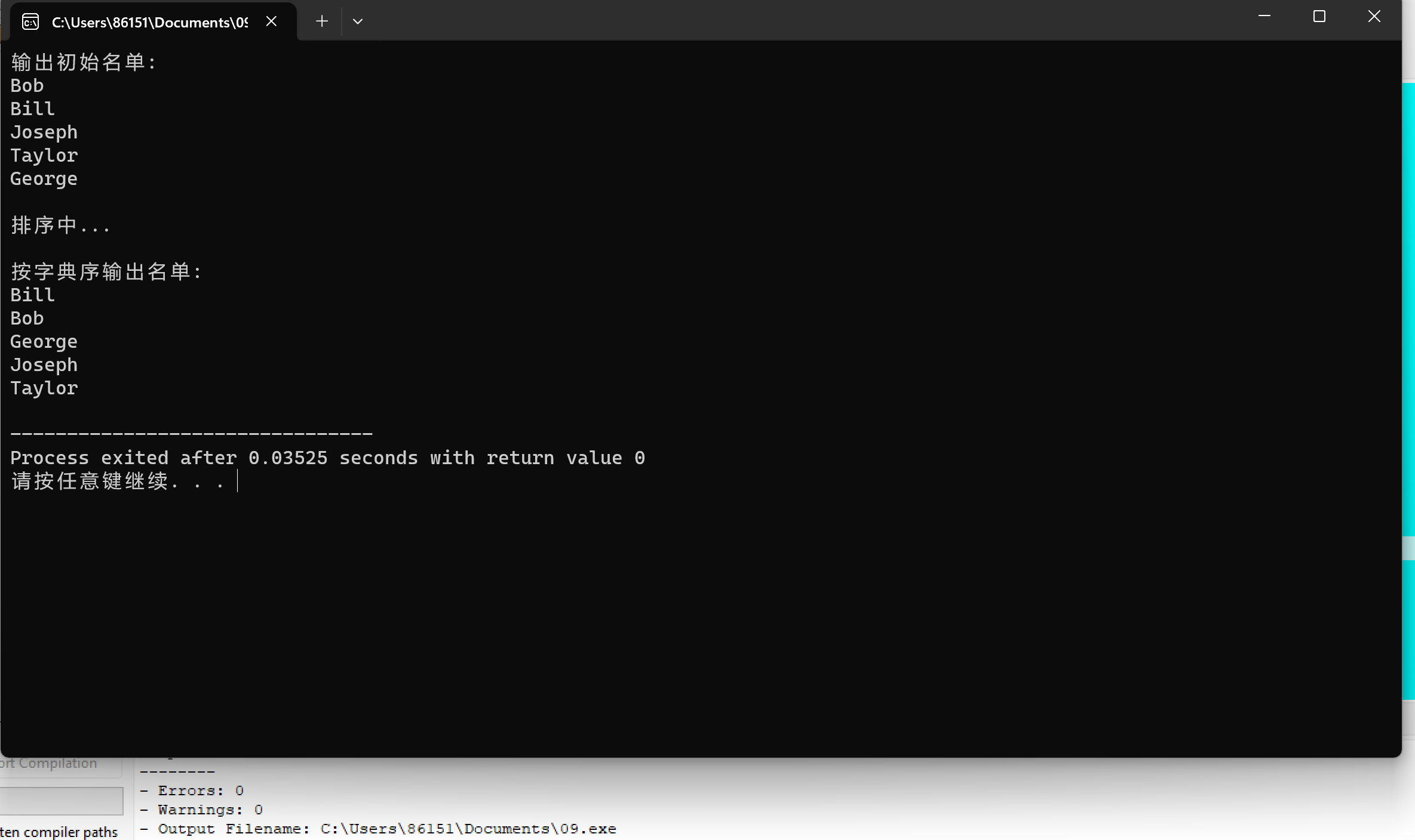 #include<stdio.h> #include <string.h> #define N 5 #define M 20 // 函数声明 void output(char str[][M], int n); void bubble_sort(char str[][M], int n); int main() { char name[][M] = {"Bob", "Bill", "Joseph", "Taylor", "George"}; int i; printf("输出初始名单:\n"); output(name, N); printf("\n排序中...\n"); bubble_sort(name, N); // 函数调用 printf("\n按字典序输出名单:\n"); output(name, N); return 0; } // 函数定义 // 功能:按行输出二维数组中的字符串 void output(char str[][M], int n){ int i; for(i = 0; i < n; ++i) printf("%s\n", str[i]); } void bubble_sort(char str[][M], int n) { int j,i; char temp[M]; for(i=0;i<n-1;i++) { for(j=0;j<n-i-1;j++)