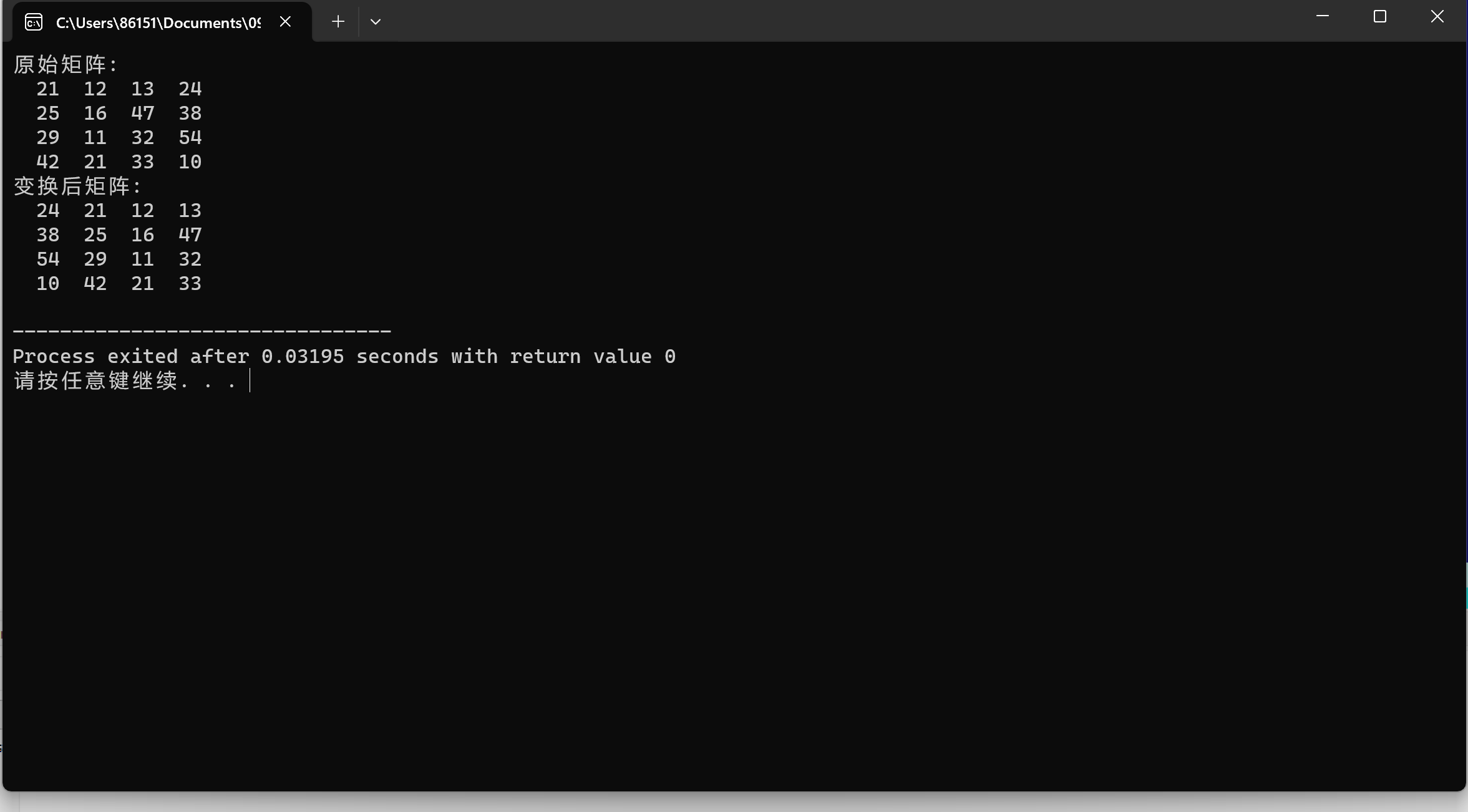 #include <stdio.h> #define N 100 #define M 4 void output(int x[][N], int n); // 函数声明 void rotate_to_right(int x[][N], int n); // 函数声明 int main() { int t[][N] = {{21, 12, 13, 24}, {25, 16, 47, 38}, {29, 11, 32, 54}, {42, 21, 33, 10}}; printf("原始矩阵:\n"); output(t, M); // 函数调用 rotate_to_right(t, M); // 函数调用 printf("变换后矩阵:\n"); output(t, M); // 函数调用 return 0; } // 函数定义 // 功能: 输出一个n*n的矩阵x void output(int x[][N], int n) { int i, j; for (i = 0; i < n; ++i) { for (j = 0; j < n; ++j) printf("%4d", x[i][j]); printf("\n"); } } void rotate_to_right(int x[][N], int n) { int s[M][N]={0}; int i,j,k,a,c,e; for(i=0;i<M;i++) { s[i][0]=x[i][3]; } for(a=0;a<M;a++) { for(j=3;j>=1;j--) { x[a][j]=x[a][j-1]; } } for(k=0;k<M;k++) { x[k][0]=s[k][0]; } }