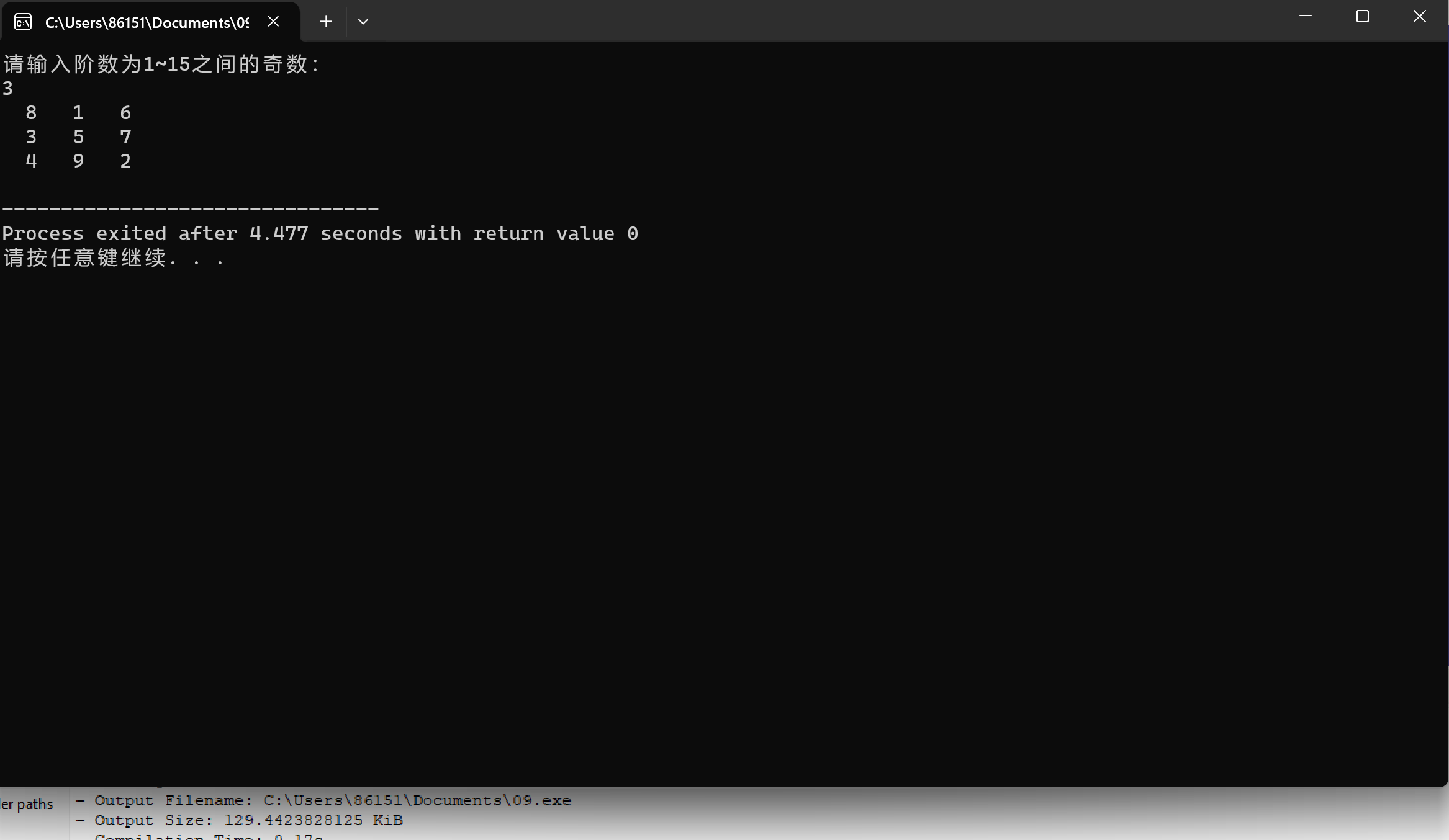 #include<stdio.h> int main() { int a[20][20]={0}; int i,j,n,k; i=1; printf("请输入阶数为1~15之间的奇数:\n"); scanf("%d",&n); j=n/2+1; a[i][j]=1; for(k=2;k<=n*n;k++) { i=i-1; j=j+1; if((i<=0)&&(j<=n)) { i=n; } if((i<=0)&&(j>n)) { i=i+2; j=j-1; } if(j>n) { j=1; } if(a[i][j]==0) { a[i][j]=k; } else { i=i+2; j=j-1; a[i][j]=k; } } for(i=1;i<=n;i++) { for(j=1;j<=n;j++) { printf("%3d ",a[i][j]); } printf("\n"); } return 0; }