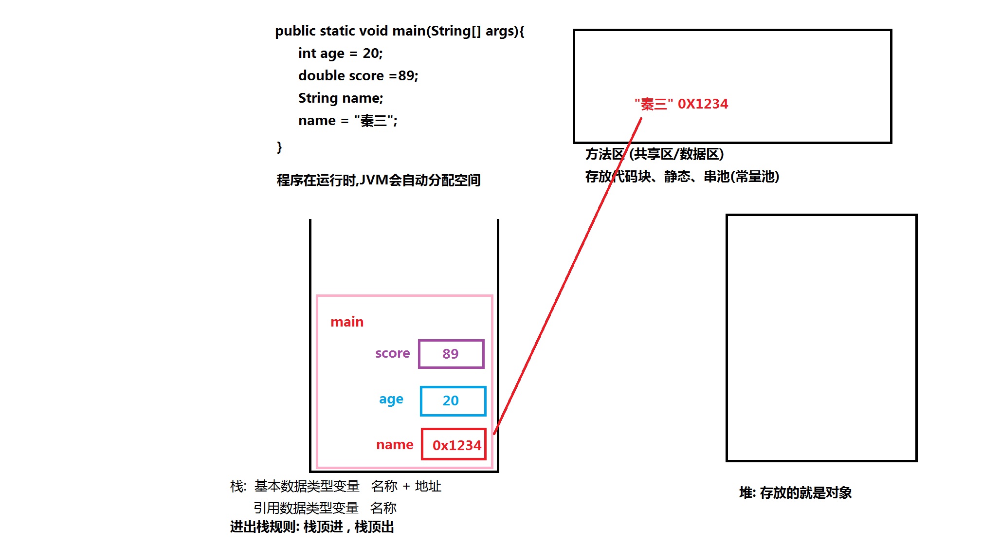 上图,基本数据类型 名称和地址都是同出一处 引用数据类型指向从方法区返回的内存地址