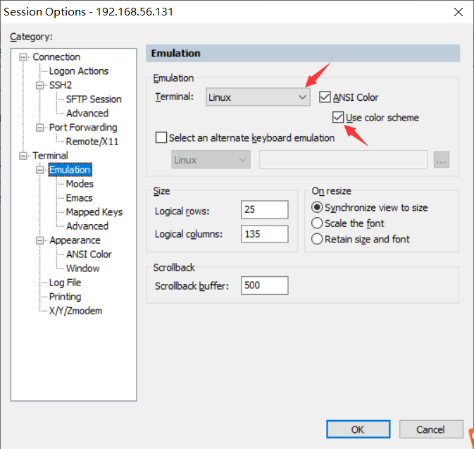 CRT软件文件显示彩色,打开以下,选择Linux的,确定保存后,再输入查看命令就可以了