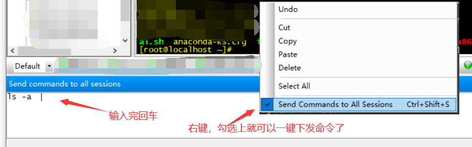 命令栏,这里如果想要一键命令到全部主机,可以右键然后选最下面的一栏,取消就把√去掉(快捷键是ctrl+shift+s)
