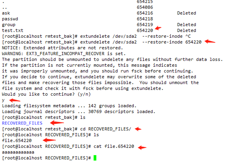 当对还在挂载中的分区进行恢复时,会提示是否继续,选择y 即可