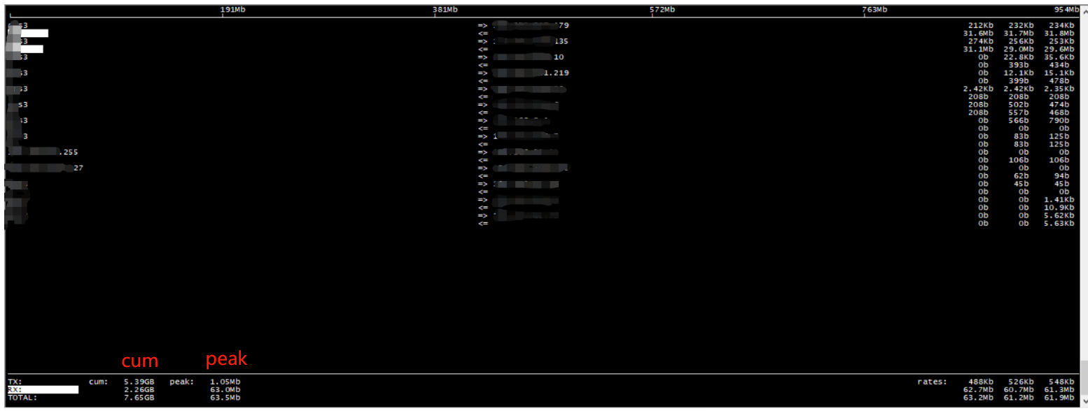 TX 行表示发送数据,RX行表示接收数据,TOTAL行表示 发送 和 接收 的全部流量; cum列表示 运行iftop到目前的发送、接收和总数据流量, peak列表示发送、接收以及总的流量峰值。 rates列表示2s、10s、40s的平均流量值