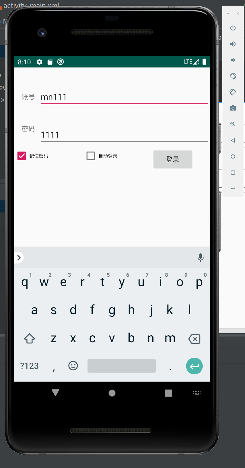 <RelativeLayout xmlns:android="http://schemas.android.com/apk/res/android" xmlns:tools="http://schemas.android.com/tools" android:layout_width="match_parent" android:layout_height="match_parent" tools:context=".MainActivity" > <TextView android:layout_width="wrap_content" android:layout_height="wrap_content" android:text="账号" android:layout_marginTop="20dp" android:layout_marginLeft="10dp" android:id="@+id/zhanghu" /> <EditText android:layout_width="match_parent" android:layout_height="wrap_content" android:layout_toRightOf="@id/zhanghu" android:id="@+id/user" /> <TextView android:layout_width="wrap_content" android:layout_height="wrap_content" android:text="密码" android:layout_marginTop="20dp" android:layout_marginLeft="10dp" android:id="@+id/mima" android:layout_below="@id/zhanghu" /> <EditText android:layout_width="match_parent" android:layout_height="wrap_content" android:layout_toRightOf="@id/mima" android:id="@+id/password" android:layout_below="@+id/user" /> <Button android:id="@+id/b1" android:layout_width="wrap_content" android:layout_height="wrap_content" android:layout_alignBaseline="@+id/cb2" android:layout_alignBottom="@+id/cb2" android:layout_alignRight="@+id/password" android:text="登录" /> <CheckBox android:id="@+id/cb1" android:layout_width="wrap_content" android:layout_height="wrap_content" android:layout_alignLeft="@+id/mima" android:layout_below="@+id/mima" android:layout_marginLeft="21dp" android:layout_marginTop="17dp" android:text="记住密码" android:textSize="10sp" /> <CheckBox android:id="@+id/cb2" android:layout_width="wrap_content" android:layout_height="wrap_content" android:layout_alignBaseline="@+id/cb1" android:layout_alignBottom="@+id/cb1" android:layout_marginLeft="20dp" android:layout_toRightOf="@+id/cb1" android:text="自动登录" android:textSize="10sp" /> </RelativeLayout>