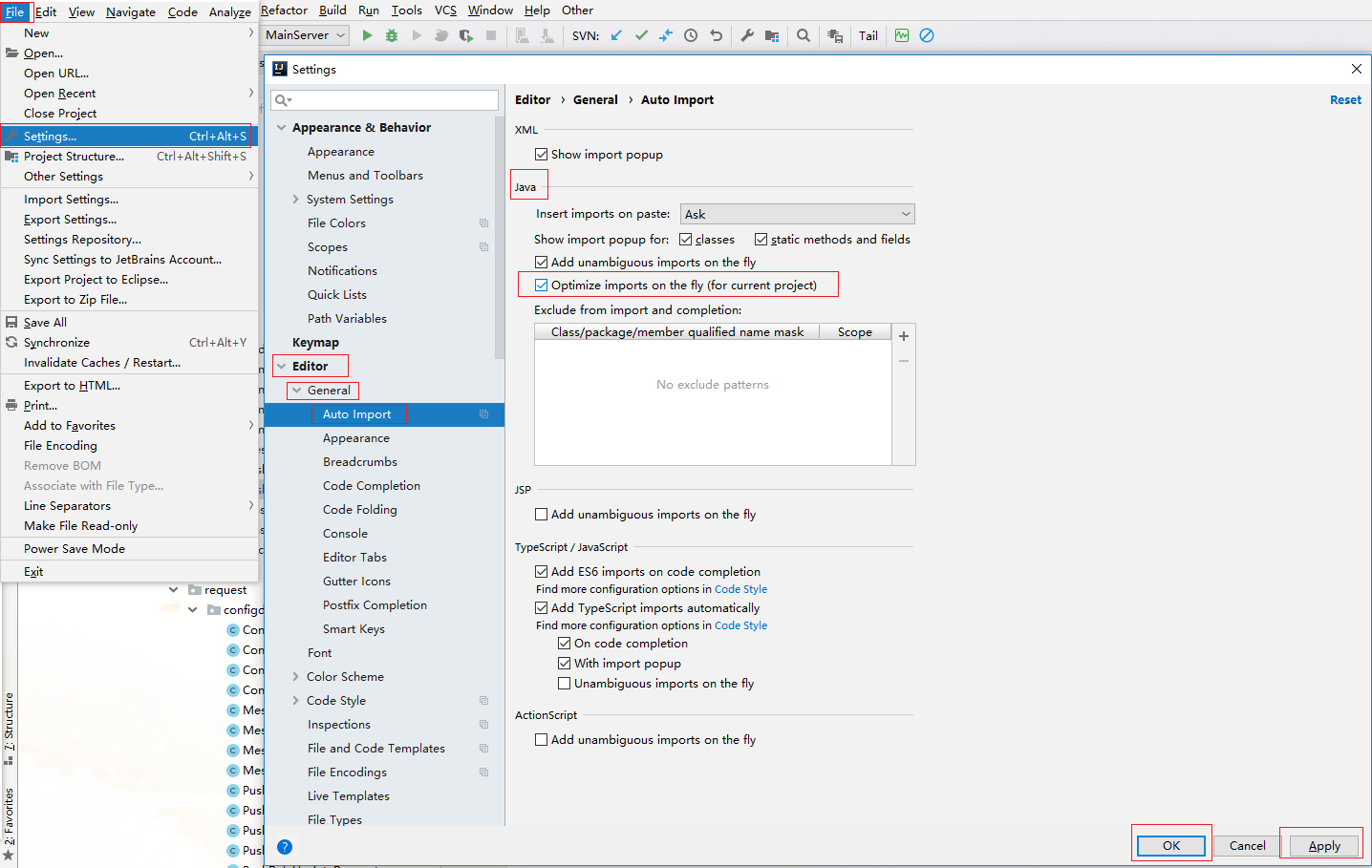 配置路径依次是:Settings --> Editor --> General --> Auto Import --> Java --> 勾选Optimize imports on the fly(for current project) --> 保存