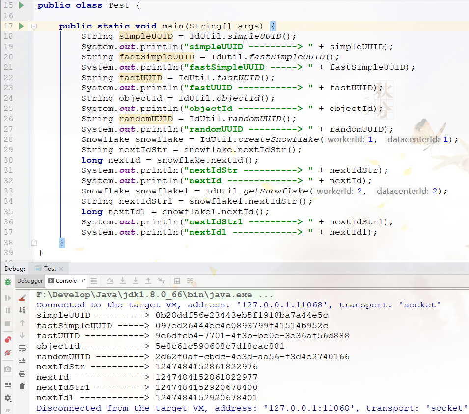 Snowflake snowflake = IdUtil.createSnowflake(1, 1);