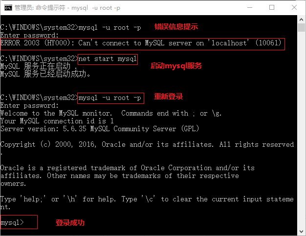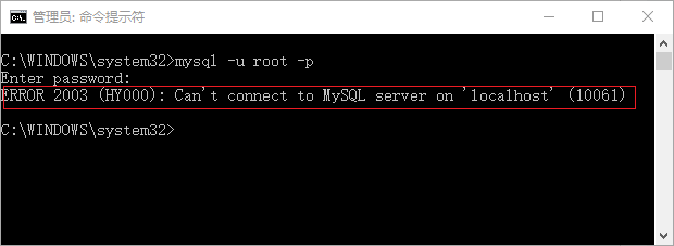 SQL异常之----启动MySQL报错:ERROR 2003 (HY000): Can't connect to MySQL server on 'localhost' (10061)