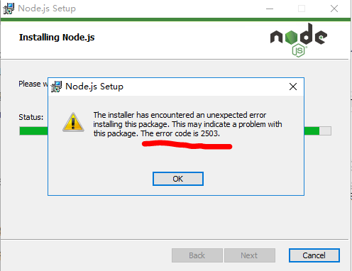 最近想安装一下node.js, 可是在安装过程中出现了2503和2502的问题, 如下图: