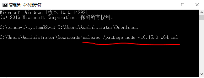 3、用msiexec命令安装, 按下回车键, 进入node.js安装