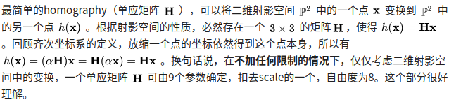 单应矩阵表达的是射影变换 其描述的是二维图像点之间的关系 二维图像用齐次坐标来表达 单应矩阵有九个变量 考虑到齐次坐标 所以这九个变量存在一个尺度问题 所以是八个自由度 说白一点 你把这个矩阵乘以一个scale 表达的是一个单应 因为本身其次坐标乘以任意scale. 是表达一个点