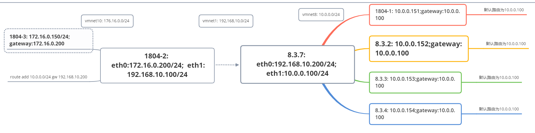 1 主机A/B 配置: 2 3 1> 网卡命名 4 5 vim /etc/default/grub 6 CMD_LINUX ='net.ifnames=0' 7 8 2> 生成配置文件 9 centos: 10 grub2-mkconfig -o /boot/grub2/grub.cfg 11 gurb2-mkconfig -o /etc/grub2.cfg 12 reboot 13 ubuntu: 14 grub-mkconfig -o /boot/grub/grub.cfg 15 update-grub 16 reboot 17 18 3> ip file 19 centos: 20 cd /etc/sysconfig/network-scripts 21 cp if..-ens33 if...eth0 22 BOOTPROTO=none 23 IPADDR=.. 24 GATEWAY=.. 25 nmcli connection reload 26 nmcli connection up eth0 27 nmcli connection show 28 29 ubuntu: 30 cd /etc/netplan/ 31 cp 01...yaml 02...yaml 32 vim 01..yaml 33 ens33 -> eth0 34 addresses: [.../24] 35 gateway4: .... 36 netplan apply 37 38 3> route -n查看默认路由 39 如果不是相对的默认网关,则需要修改,否则无返回包 40 ip route 41 ip route del .... (删除ip route 相对的不需要的路由线路) 42 route add -net ..../24 gw ..... 43 44 路由器R1/R2配置: 45 46 1> 网卡配置类似于主机,不同的是需要多增加一张网卡, 47 主机模式(vmnet1)一般会是192.168.10.0/24网段,其他是自己需要的网段(nat,vmnet8,vmnet10) 48 49 2> 路由配置 50 对于路由器R1,需要到达10.0.0.0网段,则需要自己添加路由 51 route add -net 10.0.0.0/24 gw 192.168.10.200 dev eth1 52 对于R2,需要到达172.16.0.0/24 网段,则需要自己添加路由 53 route add 172.16.0.0/24 gw 192.168.10.100 dev eth0 54 55 3> 开始路由转发功能 56 vim /etc/sysctl.conf 57 加多一行: net.ipv4.ip_forward=1 58 sysctl -p 生效 59 60 4> 此时可以开始测试,用工具tcpdump 抓包,例如在R1上抓包: 61 tcpdump -i eth0 icmp -nn(查看经过eth0网卡的包),可以自己在每个网卡抓包,如果有问题,分析哪个网卡的没有包.