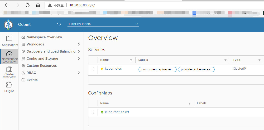 # 下载安装 [16:54:01 root@master1 ~]#wget https://github.com/vmware-tanzu/octant/releases/download/v0.24.0/octant_0.24.0_Linux-64bit.deb [16:54:26 root@master1 ~]#dpkg -i octant_0.24.0_Linux-64bit.deb Selecting previously unselected package octant. (Reading database ... 71966 files and directories currently installed.) Preparing to unpack octant_0.24.0_Linux-64bit.deb ... Unpacking octant (0.24.0) ... Setting up octant (0.24.0) ... [16:56:57 root@master1 ~]#octant version Version: 0.24.0 Git commit: 5a8648921cc2779eb62a0ac11147f12aa29f831c Built: 2021-09-09T01:54:00Z # 开始检测,注意要安装火狐和配置hosts [17:08:02 root@master1 ~]#octant --kubeconfig=/etc/kubernetes/admin.conf --listener-addr=0.0.0.0:8000 --ui-url=octant.example.com --namespace-list kubsystem,default,kubernetes-dashboard
