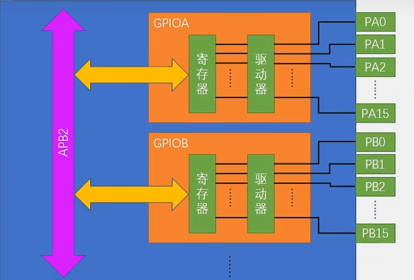 - 寄存器是一段特殊的存储器,内核通过APB2总线对寄存器进行读写,可达到输出、读取电平功能。内部寄存器是32bit,而端口仅存在16bit,故寄存器只有低16bit对应有引脚