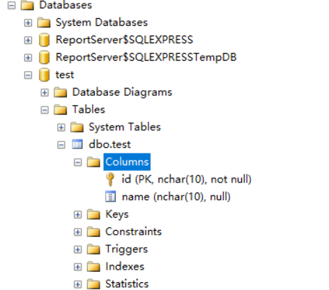 3.1 test数据库信息,test表格位于test数据库的Tables当中,其存在两个属性,id(string),name(string).