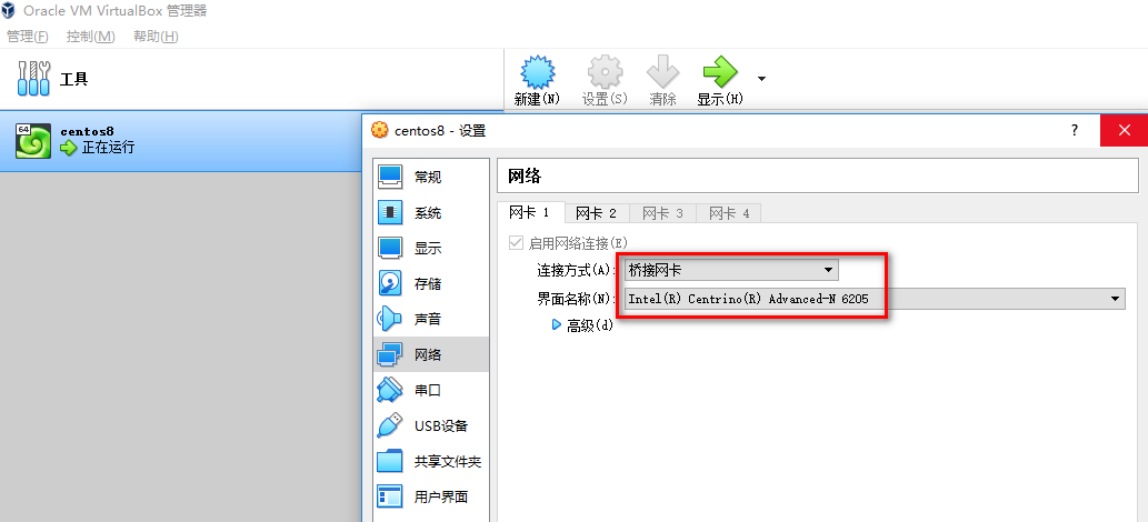2.在virtual box里点击设置,进入网络界面,选择上一步查询到的网卡名称