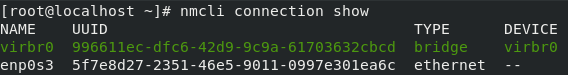 3.使用 nmcli 命令nmcli connection show,查看当前虚拟机的所有网络基本信息,这里的 enp0s3 是 centos7 自动生成的带随机数的网卡名称,每台电脑可能不一样: