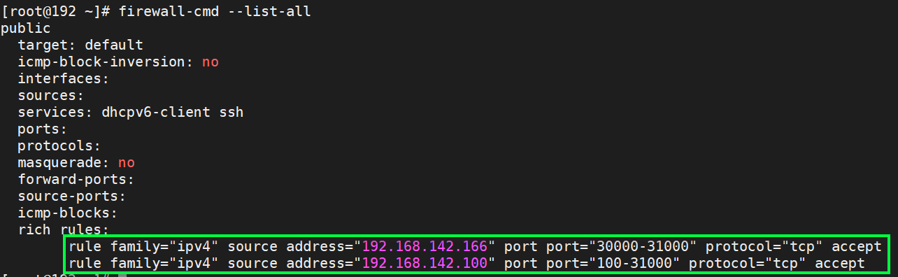3.firewall-cmd --list-all # 查询验证策略是否写入