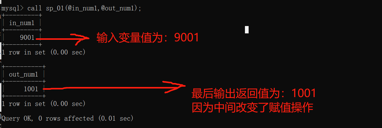 2)OUT :输出参数,表示调用者使用存储过程的返回值。既:传出给调用者返回值值(同时可,返回多个值,传出值只能是变量)